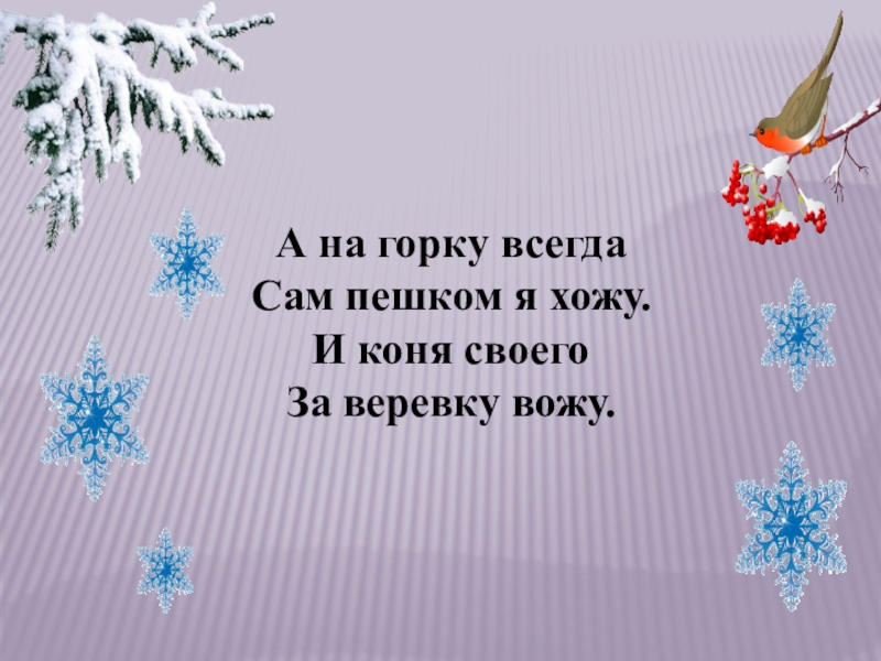 А на горку всегда Сам пешком я хожу. И коня своего  За веревку вожу.