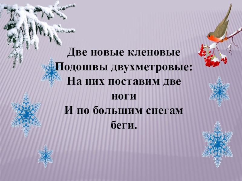 Слайд 8Две новые кленовые Подошвы двухметровые: На них поставим две ноги  И по большим снегам