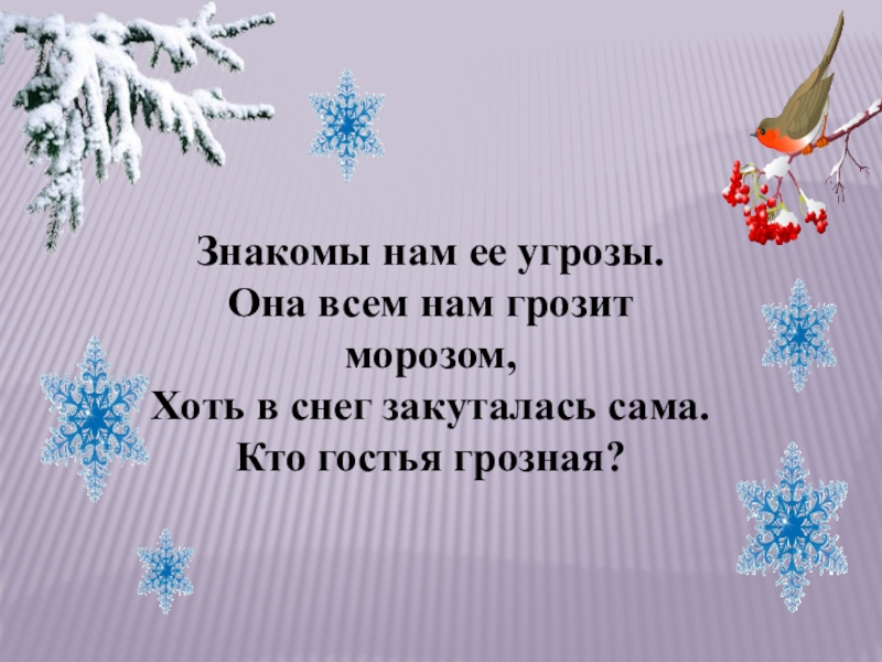 Знакомы нам ее угрозы.Она всем нам грозит морозом,Хоть в снег закуталась сама.Кто гостья грозная?