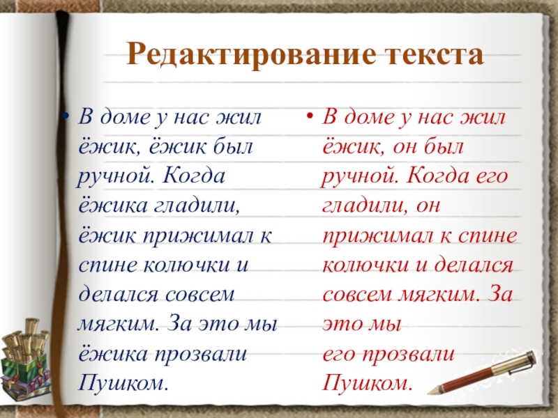 В доме у нас жил ёжик, он был ручной. Когда его гладили, он прижимал к спине колючки и делался совсем мягким. За это мы его прозвали Пушком.