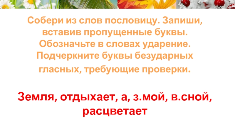 Слайд 8Собери из слов пословицу. Запиши, вставив пропущенные буквы. Обозначьте в словах