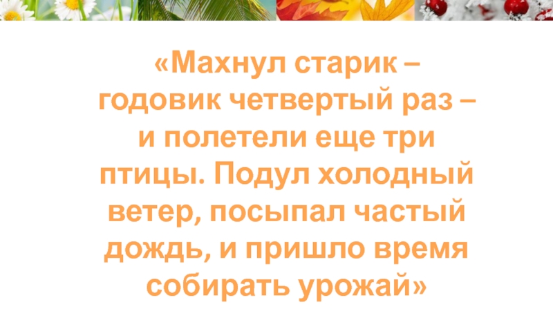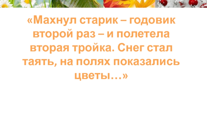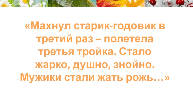 Слайд 10«Махнул старик-годовик в третий раз – полетела третья тройка. Стало жарко,