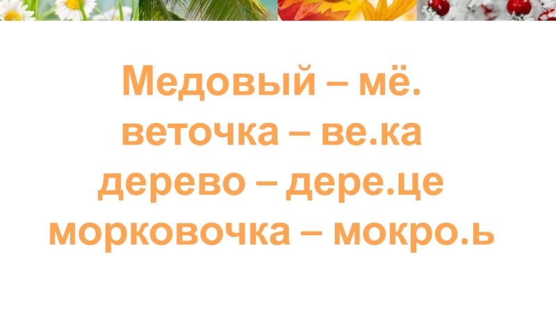 Медовый – мё.веточка – ве.кадерево – дере.цеморковочка – мокро.ь