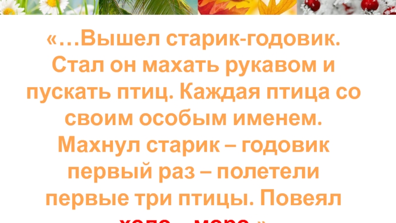 Слайд 6«…Вышел старик-годовик. Стал он махать рукавом и пускать птиц. Каждая птица
