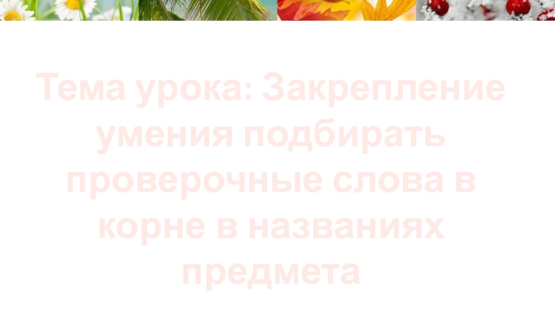 Слайд 3Тема урока: Закрепление умения подбирать проверочные слова в корне в названиях