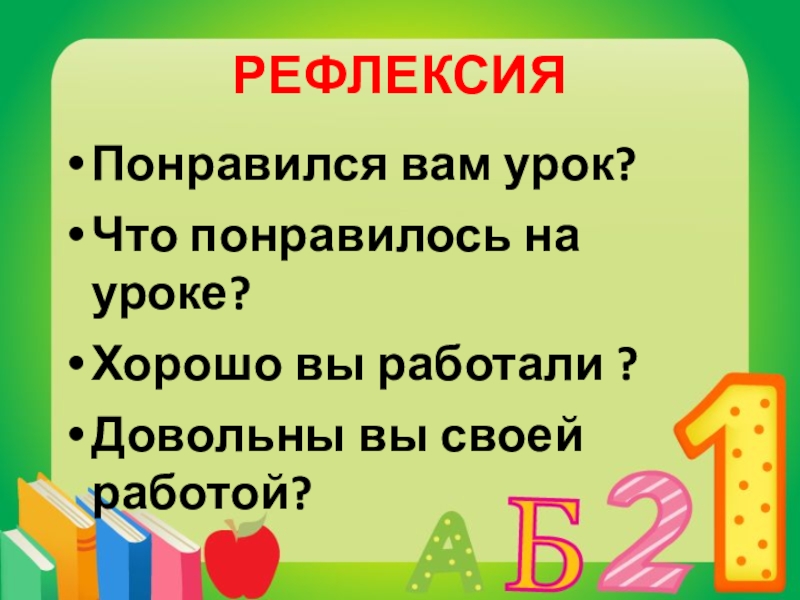 РЕФЛЕКСИЯПонравился вам урок?Что понравилось на уроке?Хорошо вы работали ?Довольны вы своей работой?