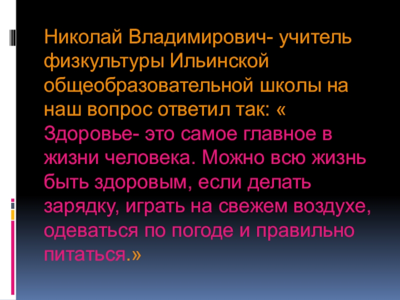 Слайд 9Николай Владимирович- учитель физкультуры Ильинской общеобразовательной школы на наш вопрос ответил