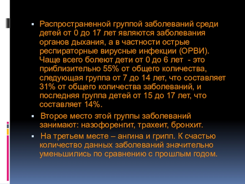 заболевания органов дыхания, а в частности острые респираторные вирусные инфекции (ОРВИ). Чаще всего болеют дети от 0 до 6 лет - это приблизительно 55% от общего количества, следующая группа от 7 до 14 лет, что составляет 31% от общего количества заболеваний, и последняя группа детей от 15 до 17 лет, что составляет 14%.