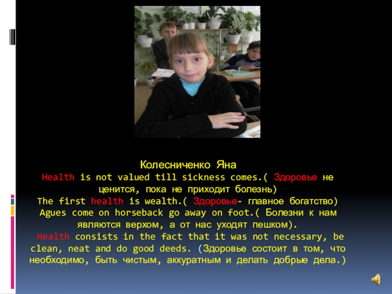 Health consists in the fact that it was not necessary, be clean, neat and do good deeds. (Здоровье состоит в том, что необходимо, быть чистым, аккуратным и делать добрые дела.)