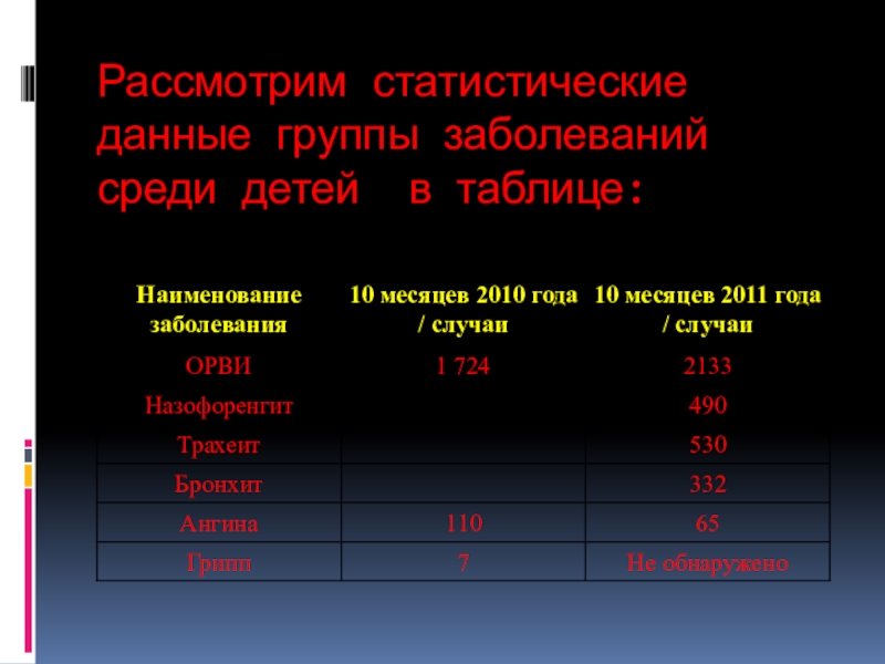 Слайд 12Рассмотрим статистические данные группы заболеваний среди детей в таблице:
