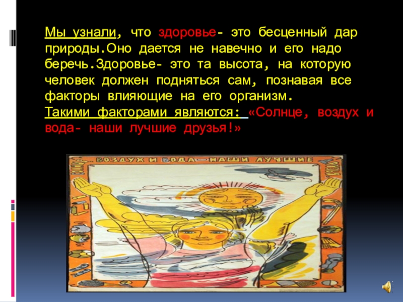 Слайд 14Мы узнали, что здоровье- это бесценный дар природы.Оно дается не навечно