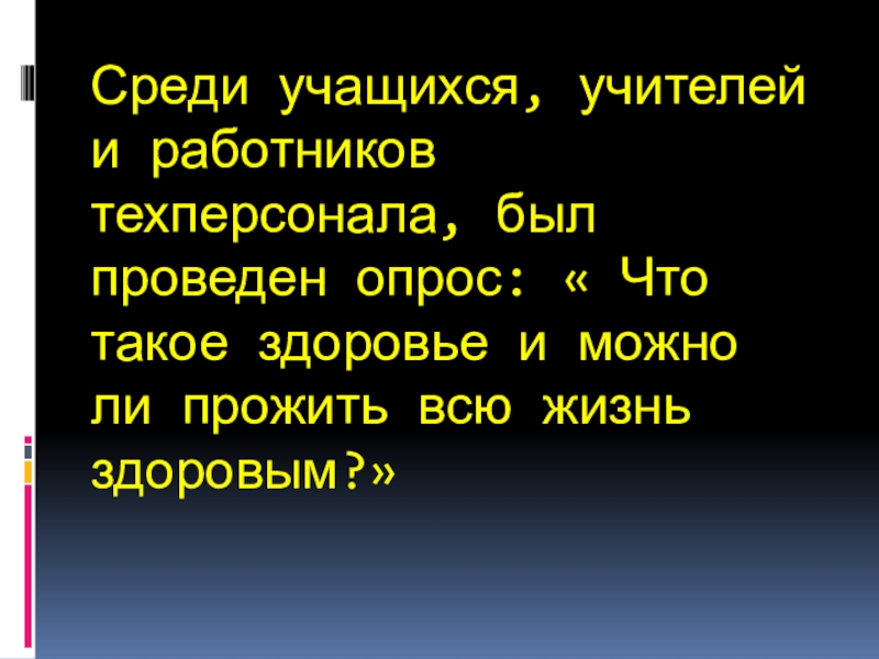 Слайд 4Среди учащихся, учителей и работников техперсонала, был проведен опрос: « Что