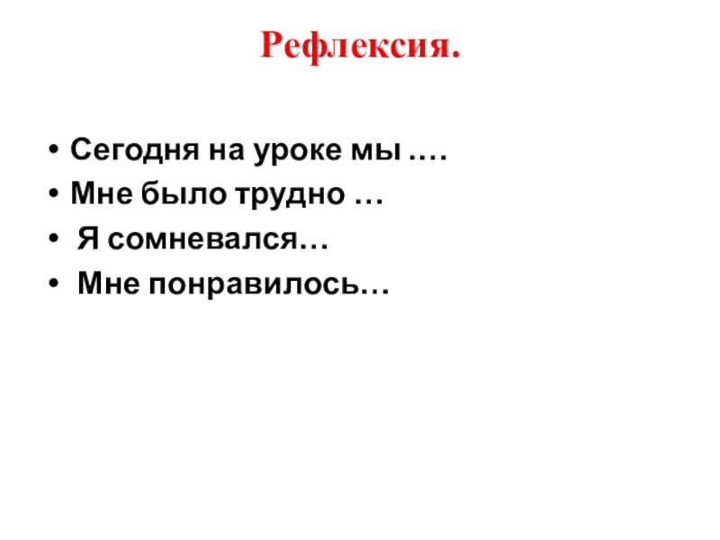 Рефлексия. Сегодня на уроке мы .…Мне было трудно … Я сомневался… Мне понравилось…