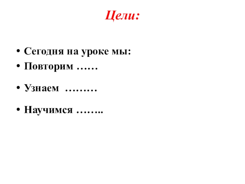 Цели: Сегодня на уроке мы:Повторим ……Узнаем ………Научимся ……..