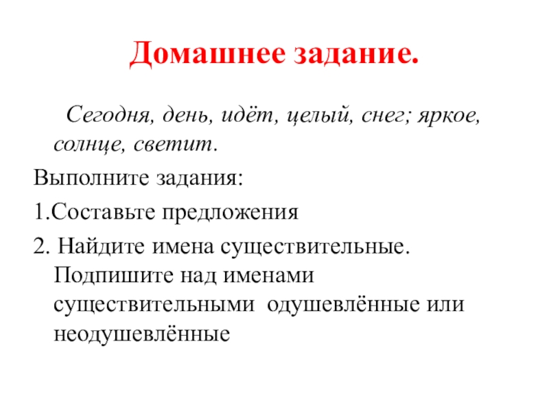 Домашнее задание.   Сегодня, день, идёт, целый, снег; яркое, солнце, светит.Выполните задания:1.Составьте предложения2. Найдите имена существительные.