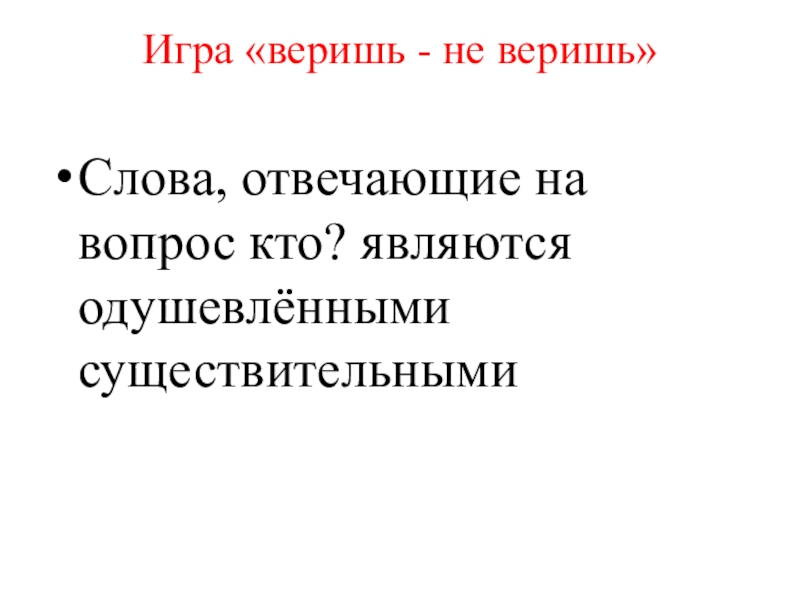 Игра «веришь - не веришь»  Слова, отвечающие на вопрос кто? являются одушевлёнными существительными