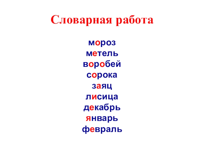 Словарная работаморозметельворобейсороказаяцлисицадекабрьянварьфевраль