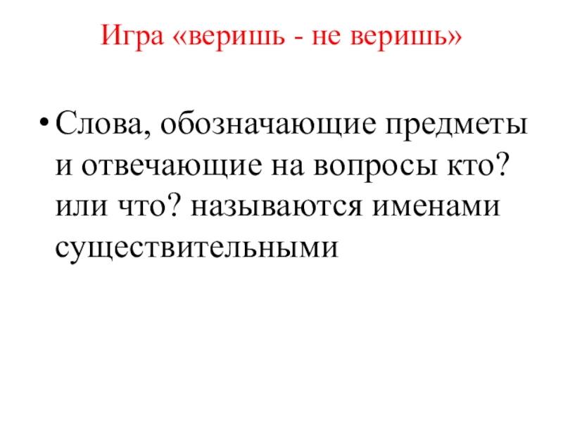 Игра «веришь - не веришь»  Слова, обозначающие предметы и отвечающие на вопросы кто? или что? называются