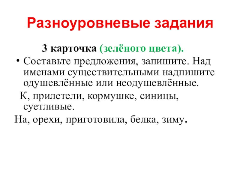 Разноуровневые задания      3 карточка (зелёного цвета). Составьте предложения, запишите. Над именами существительными