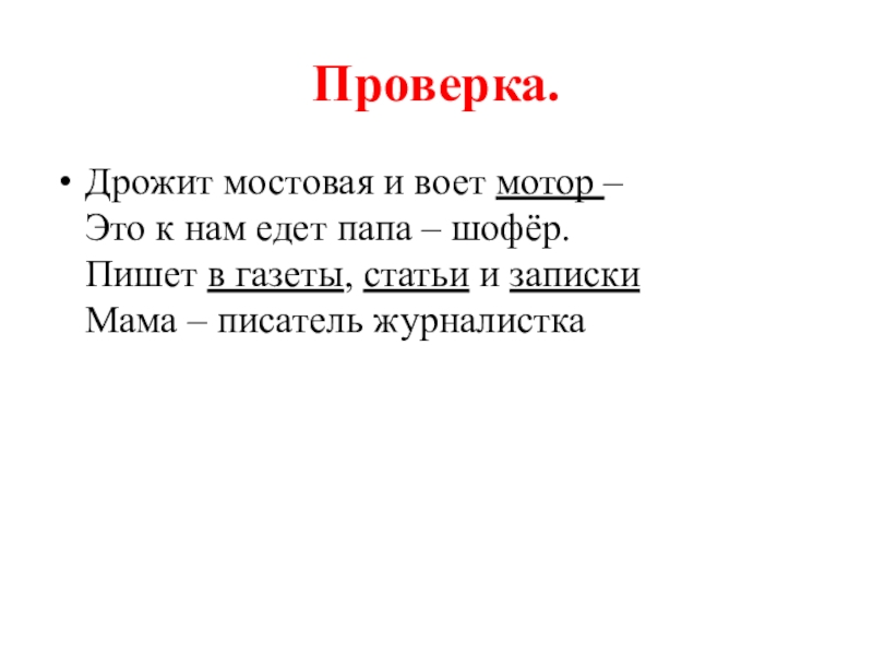 Проверка.Дрожит мостовая и воет мотор – Это к нам едет папа – шофёр. Пишет в газеты, статьи