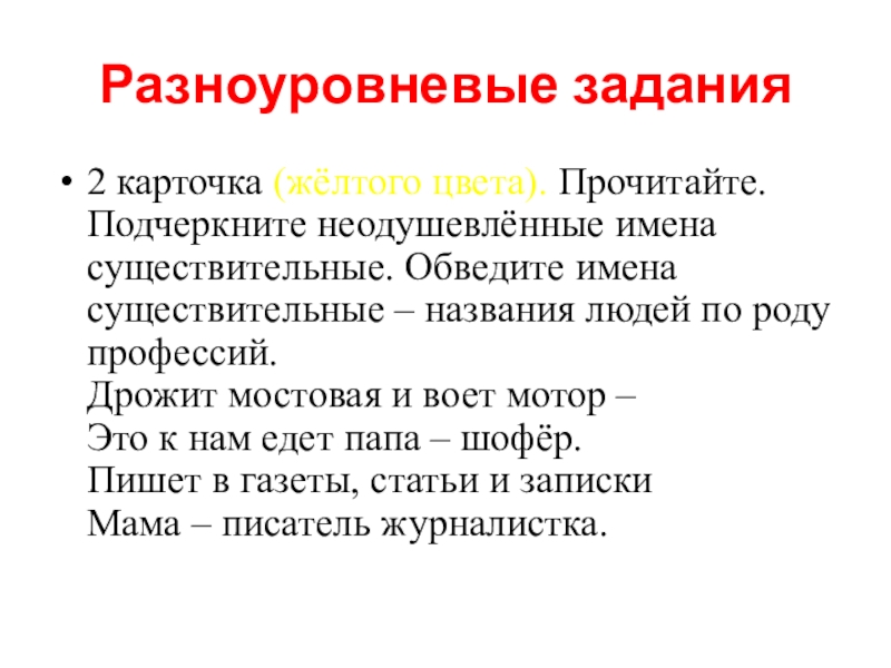 Разноуровневые задания 2 карточка (жёлтого цвета). Прочитайте. Подчеркните неодушевлённые имена существительные. Обведите имена существительные – названия людей