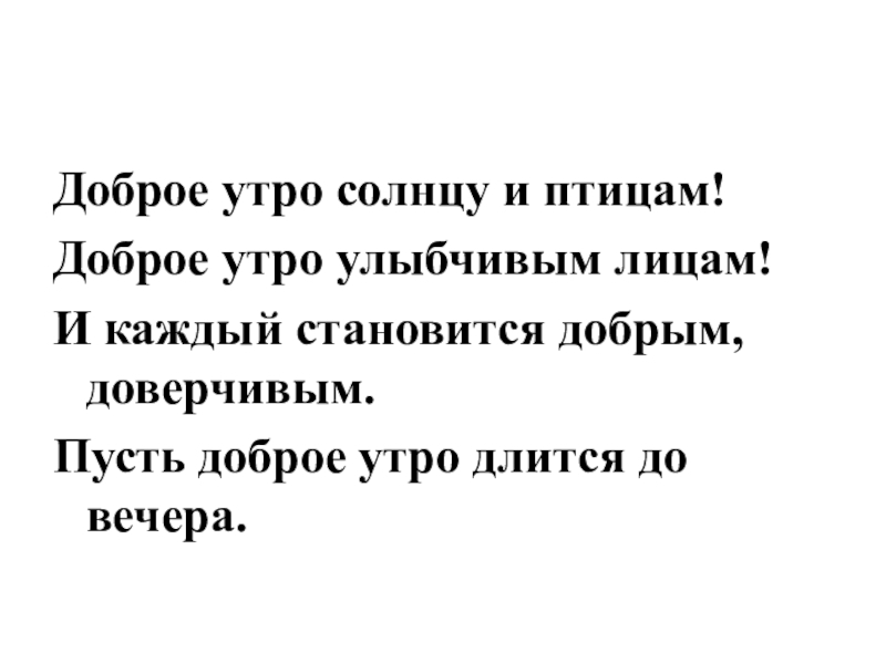 Доброе утро солнцу и птицам!Доброе утро улыбчивым лицам!И каждый становится добрым, доверчивым.Пусть доброе утро длится до вечера.