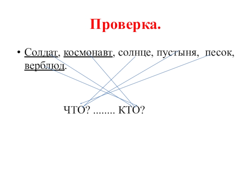 Проверка.Солдат, космонавт, солнце, пустыня, песок, верблюд.        ЧТО? ........ КТО?