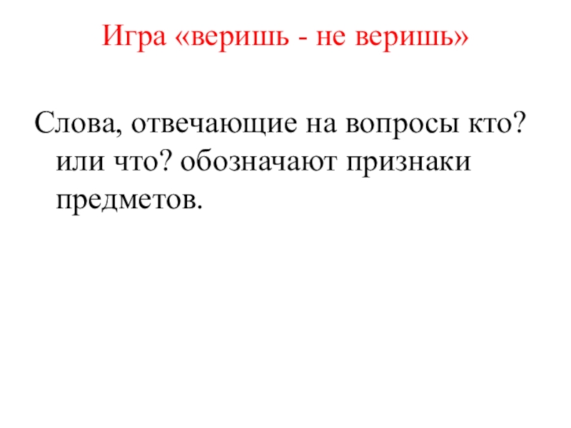 Игра «веришь - не веришь»  Слова, отвечающие на вопросы кто? или что? обозначают признаки предметов.