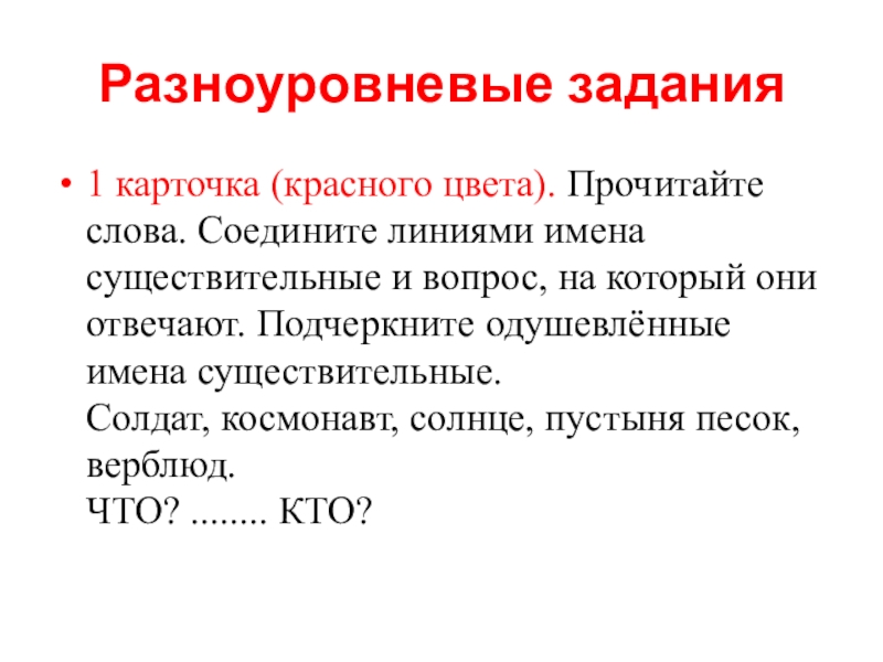 Разноуровневые задания 1 карточка (красного цвета). Прочитайте слова. Соедините линиями имена существительные и вопрос, на который они