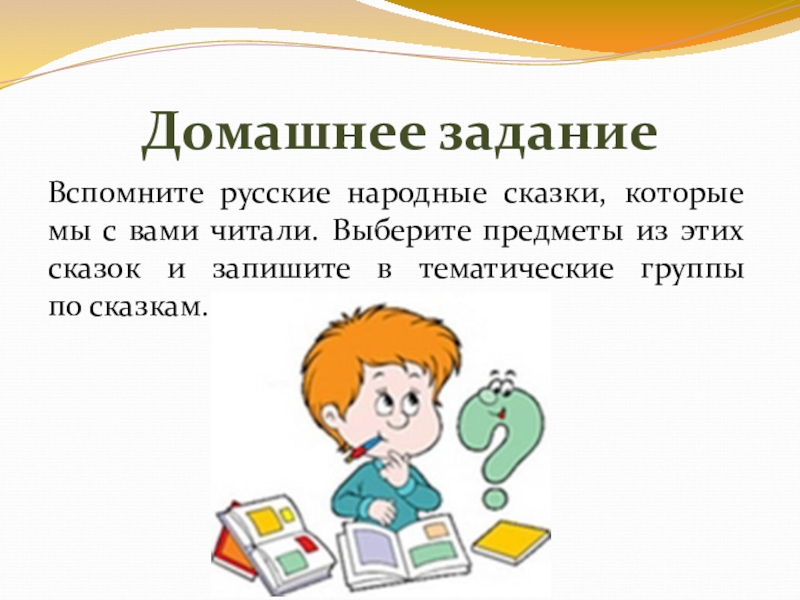 Домашнее заданиеВспомните русские народные сказки, которые мы с вами читали. Выберите предметы из этих сказок и запишите