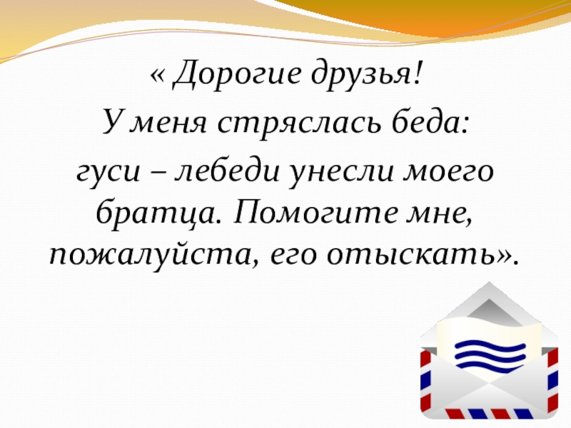 « Дорогие друзья! У меня стряслась беда:гуси – лебеди унесли моего братца. Помогите мне, пожалуйста, его