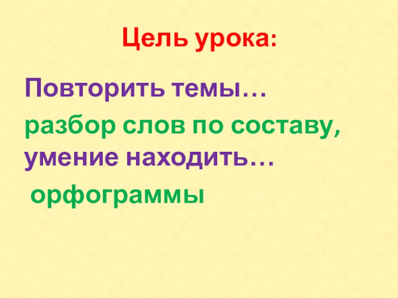 Цель урока:Повторить темы…разбор слов по составу, умение находить… орфограммы