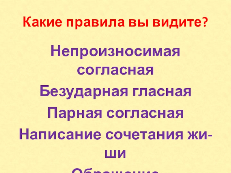 Какие правила вы видите?Непроизносимая согласнаяБезударная гласнаяПарная согласнаяНаписание сочетания жи-шиОбращение