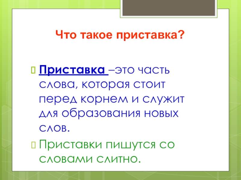 Что такое приставка?Приставка –это часть слова, которая стоит перед корнем и служит для образования новых слов.Приставки пишутся