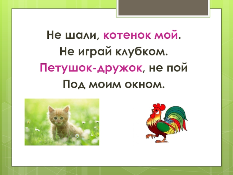 Не шали, котенок мой.Не играй клубком.Петушок-дружок, не пойПод моим окном.