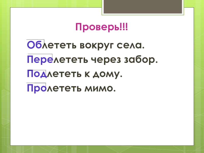 Проверь!!!Облететь вокруг села.Перелететь через забор.Подлететь к дому.Пролететь мимо.