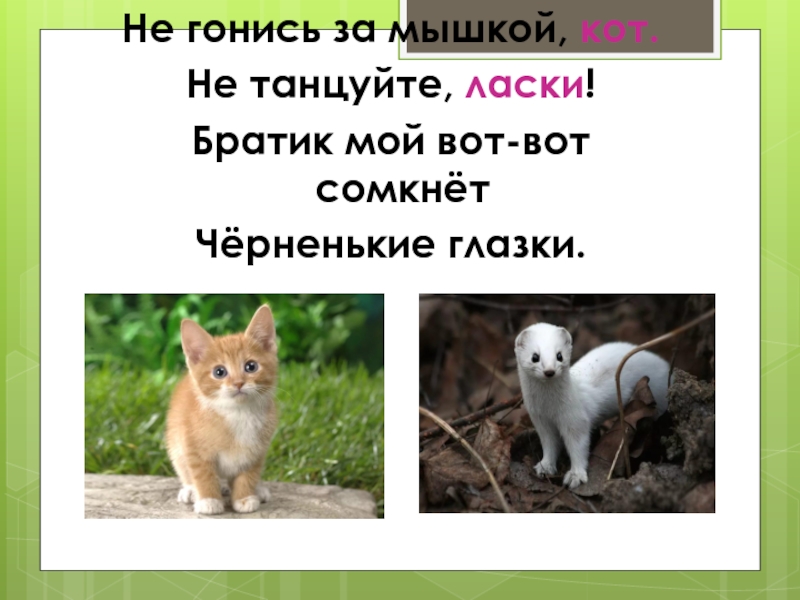 Не гонись за мышкой, кот.Не танцуйте, ласки!Братик мой вот-вот сомкнётЧёрненькие глазки.