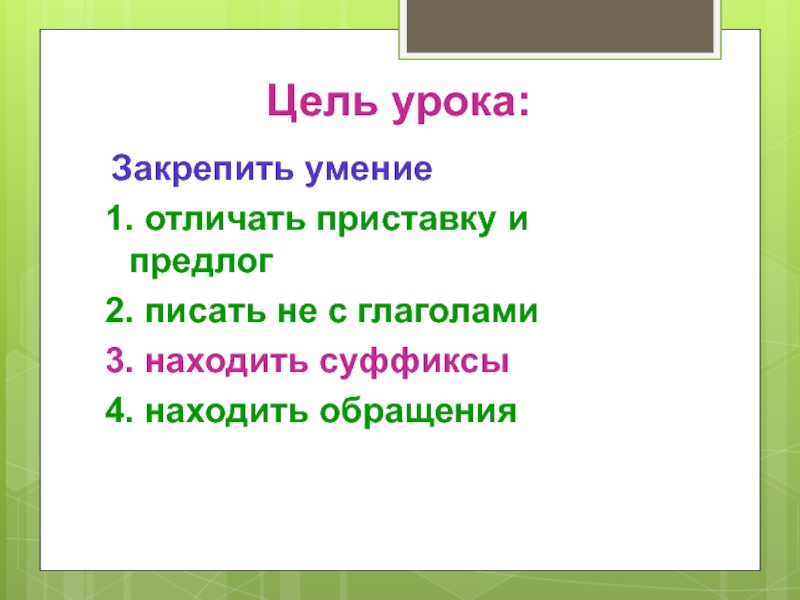 Цель урока: Закрепить умение1. отличать приставку и предлог2. писать не с глаголами3. находить суффиксы4. находить обращения
