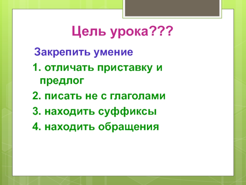 Цель урока??? Закрепить умение1. отличать приставку и предлог2. писать не с глаголами3. находить суффиксы4. находить обращения