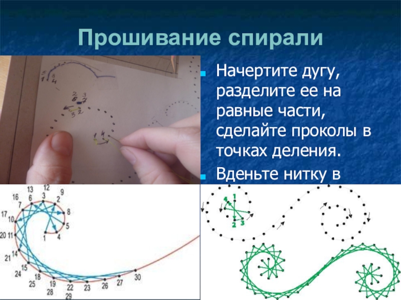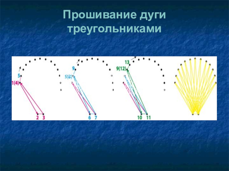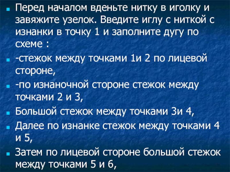 Перед началом вденьте нитку в иголку и завяжите узелок. Введите иглу с ниткой с изнанки в точку 1 и заполните дугу по схеме