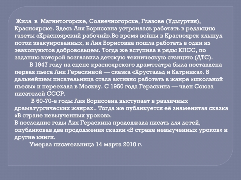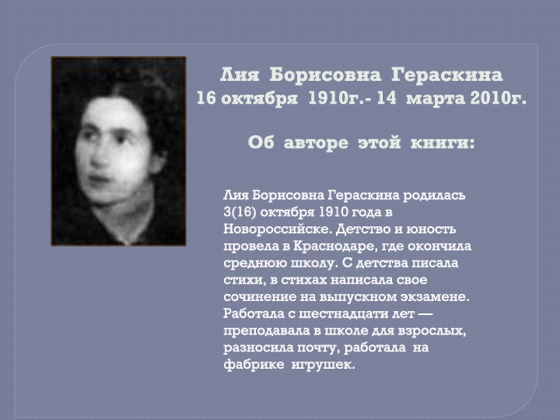 Лия Борисовна Гераскина родилась 3(16) октября 1910 года в Новороссийске. Детство и юность провела в Краснодаре, где окончила среднюю школу. С детства писала стихи, в стихах написала свое сочинение на выпускном экзамене. Работала с шестнадцати лет — преподавала в школе для взрослых, разносила почту, работала на фабрике игрушек.