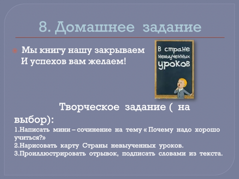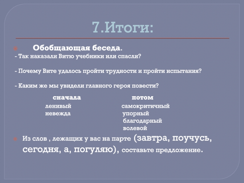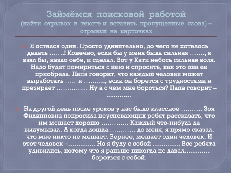 На другой день после уроков у нас было классное ………. Зоя Филипповна попросила неуспевающих ребят рассказать, что им мешает хорошо …………. Каждый что-нибудь да выдумывал. А когда дошла ………… до меня, я прямо сказал, что мне никто не мешает. Вернее, мешает один человек. И этот человек –…………. Но я буду с собой …………. Все ребята удивились, потому что я раньше никогда не давал………… бороться с собой.
