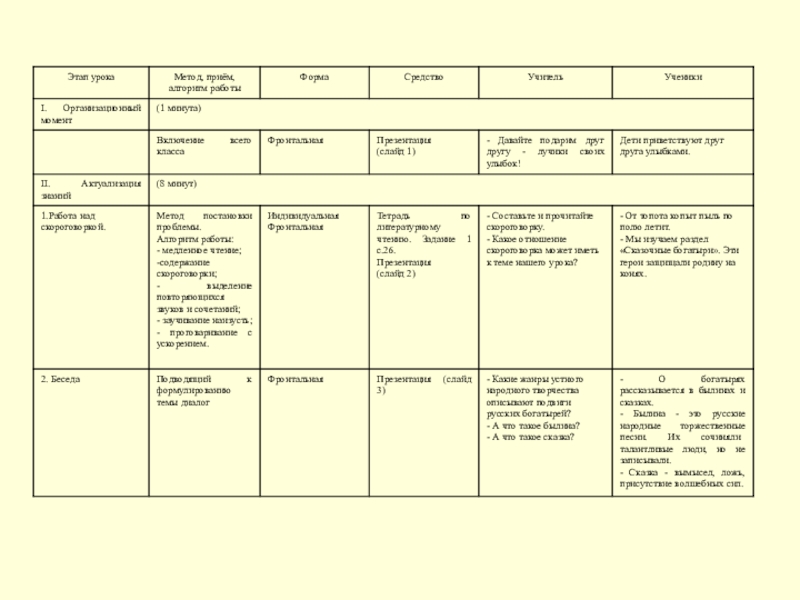 На этапе актуализации и постановки проблемы использовался метод постановки проблемы. Ученикам предлагалось составить скороговорку и, по предложенному алгоритму, научиться правильному произношению повторяющихся звуков. Это способствовало развитию чёткости речи, дикции, а также созданию мотива для изучения нового материала, актуализации имеющихся у учащихся знаний, необходимых для изучения новой темы. Подводящий к формулированию темы диалог на данном этапе позволил учащимся повторить имеющиеся знания о жанрах устного народного творчества, самостоятельно определить тему урока. На этапе актуализации знаний использовались индивидуальная и фронтальная форма работы.