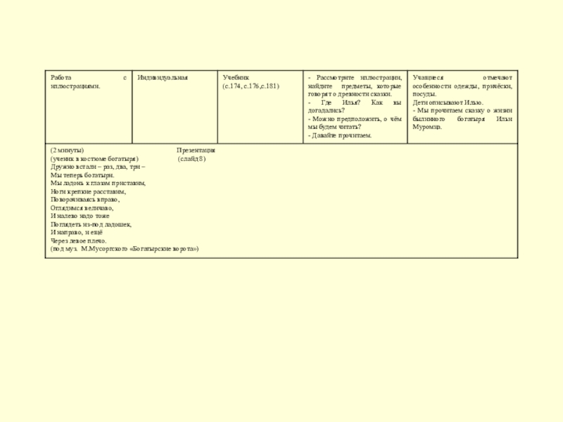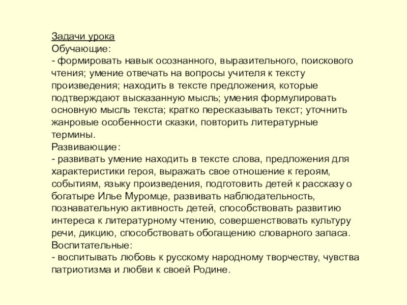 - развивать умение находить в тексте слова, предложения для характеристики героя, выражать свое отношение к героям, событиям, языку произведения, подготовить детей к рассказу о богатыре Илье Муромце, развивать наблюдательность, познавательную активность детей, способствовать развитию интереса к литературному чтению, совершенствовать культуру речи, дикцию, способствовать обогащению словарного запаса.