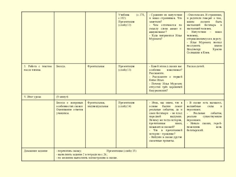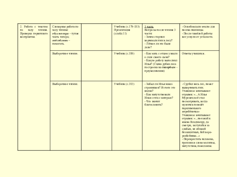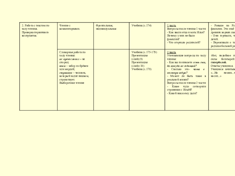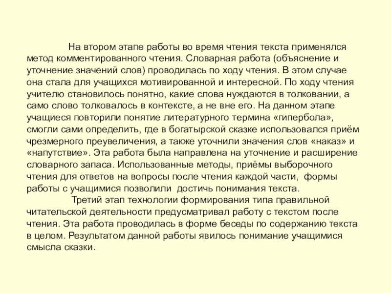 чтения текста применялся метод комментированного чтения. Словарная работа (объяснение и уточнение значений слов) проводилась по ходу чтения. В этом случае она стала для учащихся мотивированной и интересной. По ходу чтения учителю становилось понятно, какие слова нуждаются в толковании, а само слово толковалось в контексте, а не вне его. На данном этапе учащиеся повторили понятие литературного термина «гипербола», смогли сами определить, где в богатырской сказке использовался приём чрезмерного преувеличения, а также уточнили значения слов «наказ» и «напутствие». Эта работа была направлена на уточнение и расширение словарного запаса. Использованные методы, приёмы выборочного чтения для ответов на вопросы после чтения каждой части, формы работы с учащимися позволили достичь понимания текста.