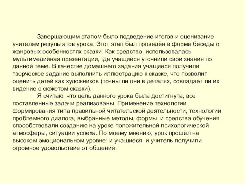 оценивание учителем результатов урока. Этот этап был проведён в форме беседы о жанровых особенностях сказки. Как средство, использовалась мультимедийная презентации, где учащиеся уточнили свои знания по данной теме. В качестве домашнего задания учащиеся получили творческое задание выполнить иллюстрацию к сказке, что позволит оценить детей как художников (точны ли они в деталях, совпадает ли их видение с сюжетом сказки).