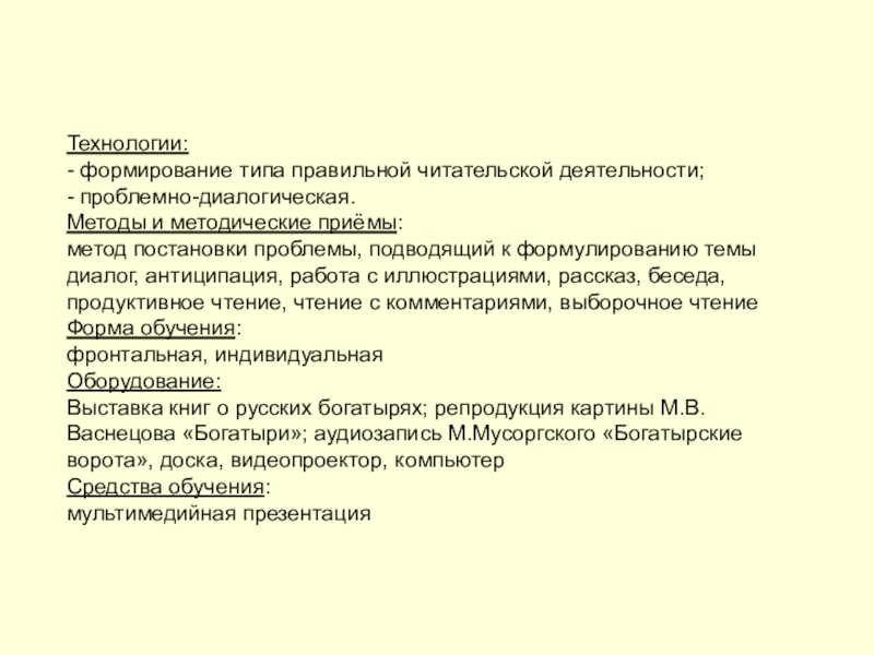 Выставка книг о русских богатырях; репродукция картины М.В. Васнецова «Богатыри»; аудиозапись М.Мусоргского «Богатырские ворота», доска, видеопроектор, компьютер