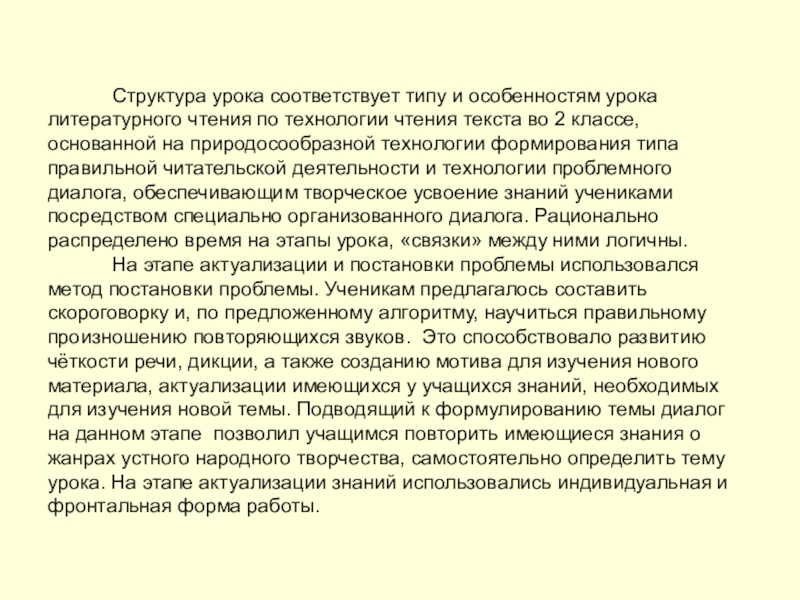 литературного чтения по технологии чтения текста во 2 классе, основанной на природосообразной технологии формирования типа правильной читательской деятельности и технологии проблемного диалога, обеспечивающим творческое усвоение знаний учениками посредством специально организованного диалога. Рационально распределено время на этапы урока, «связки» между ними логичны.