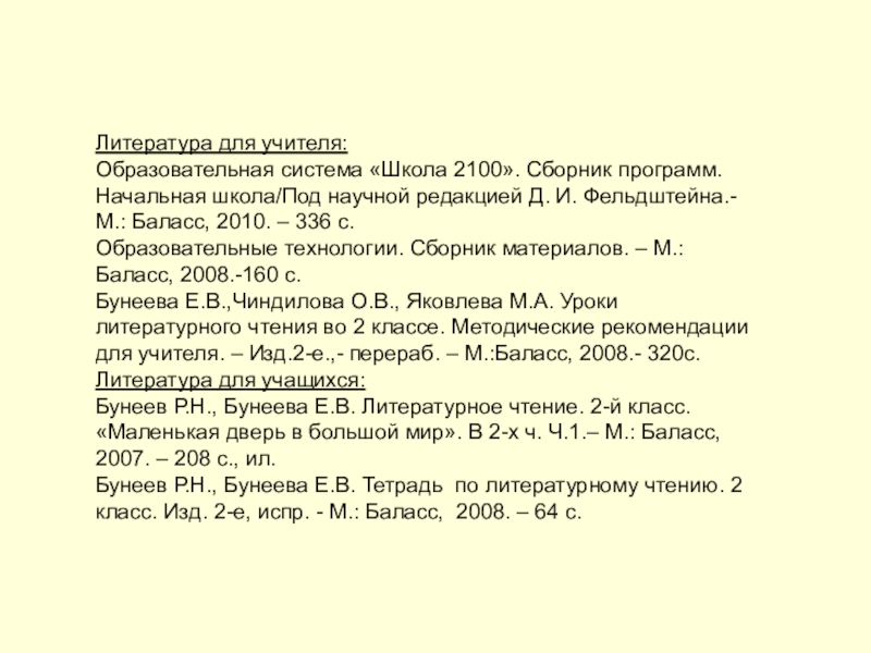 Бунеева Е.В.,Чиндилова О.В., Яковлева М.А. Уроки литературного чтения во 2 классе. Методические рекомендации для учителя. – Изд.2-е.,- перераб. – М.:Баласс, 2008.- 320с.