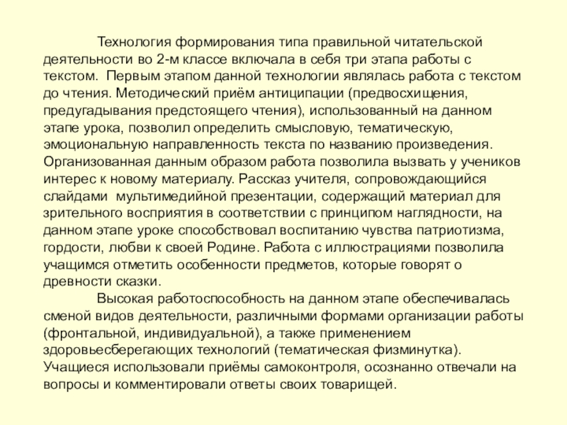 во 2-м классе включала в себя три этапа работы с текстом. Первым этапом данной технологии являлась работа с текстом до чтения. Методический приём антиципации (предвосхищения, предугадывания предстоящего чтения), использованный на данном этапе урока, позволил определить смысловую, тематическую, эмоциональную направленность текста по названию произведения. Организованная данным образом работа позволила вызвать у учеников интерес к новому материалу. Рассказ учителя, сопровождающийся слайдами мультимедийной презентации, содержащий материал для зрительного восприятия в соответствии с принципом наглядности, на данном этапе уроке способствовал воспитанию чувства патриотизма, гордости, любви к своей Родине. Работа с иллюстрациями позволила учащимся отметить особенности предметов, которые говорят о древности сказки.